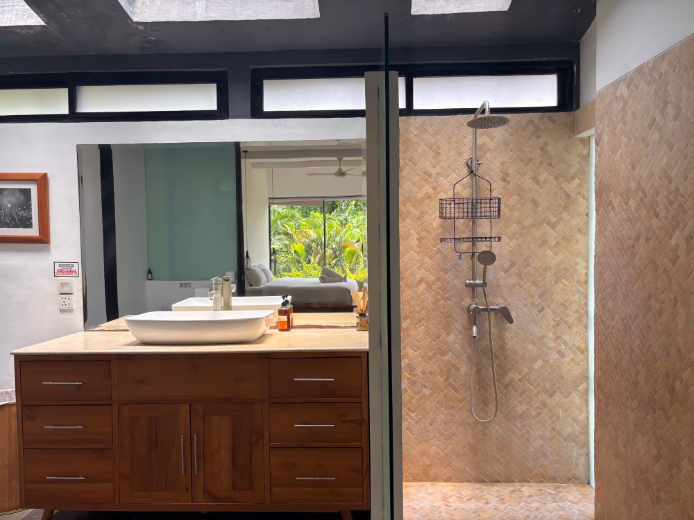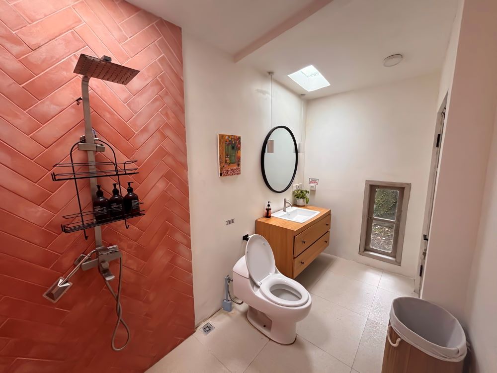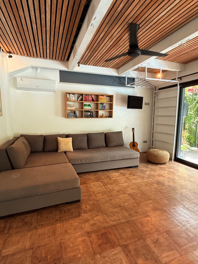 With a fully functional kitchen, a designer dining room, a funky toilet and a comfortable TV room, the downstairs area is completely open space letting air flow and light shine through elegantly. You can shut the doors and use the AC from the TV room and downstairs bedroom to cool the area and beat the heat, however opening all the windows and using fans does have a good air flow. The kitchen is fully equipped for all your needs with breakfast upon request (all you need to do is pay for your groceries), and lunch or dinner are available in a family style (groceries +15%). The contemporary dining room area can accommodate up to 6 people around the dining table.