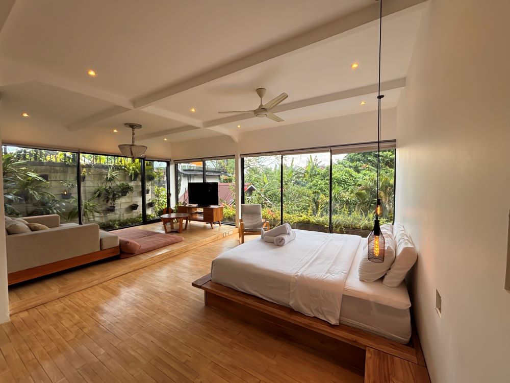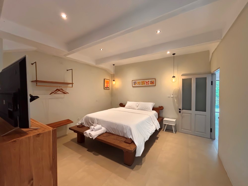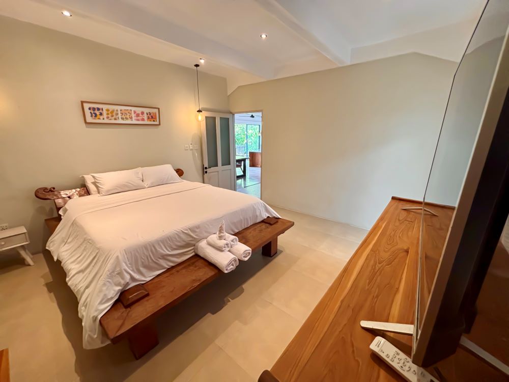 Walking up the enclosed wooden staircase you reach the 2nd floor. The Master bedroom is enormous and provide a living space all onto its own, with a couch area, and large toilet, you can get excused for being separated from the rest of the group. The large windows overlooking the trees, creates the ultimate relaxing experience. Fully complete with AC and Internet TV, a day spent in the room will do wonders. The room next door is used as the baby room, it can have a double mattress on the floor if you need a 3rd bedroom. The storage room will be locked during your stay.