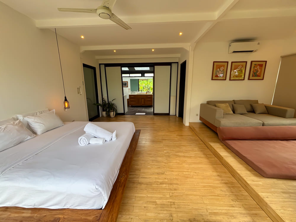 A modern Japanese inspired bedroom, has an 180 degree view of the garden as well, letting natural light shine in the neutral colours of this extremely comfortable space. Each space has been designed as a hangout spot, so this place is no different, whether you're chilling on the day bed reading, or hanging out on the veranda, admiring the views from above.