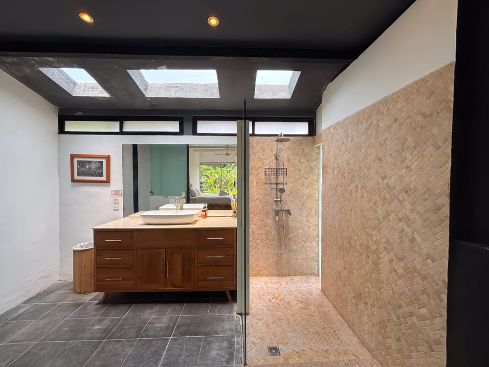The toilet upstairs features an open space shower, a huge mirror and natural air flow.